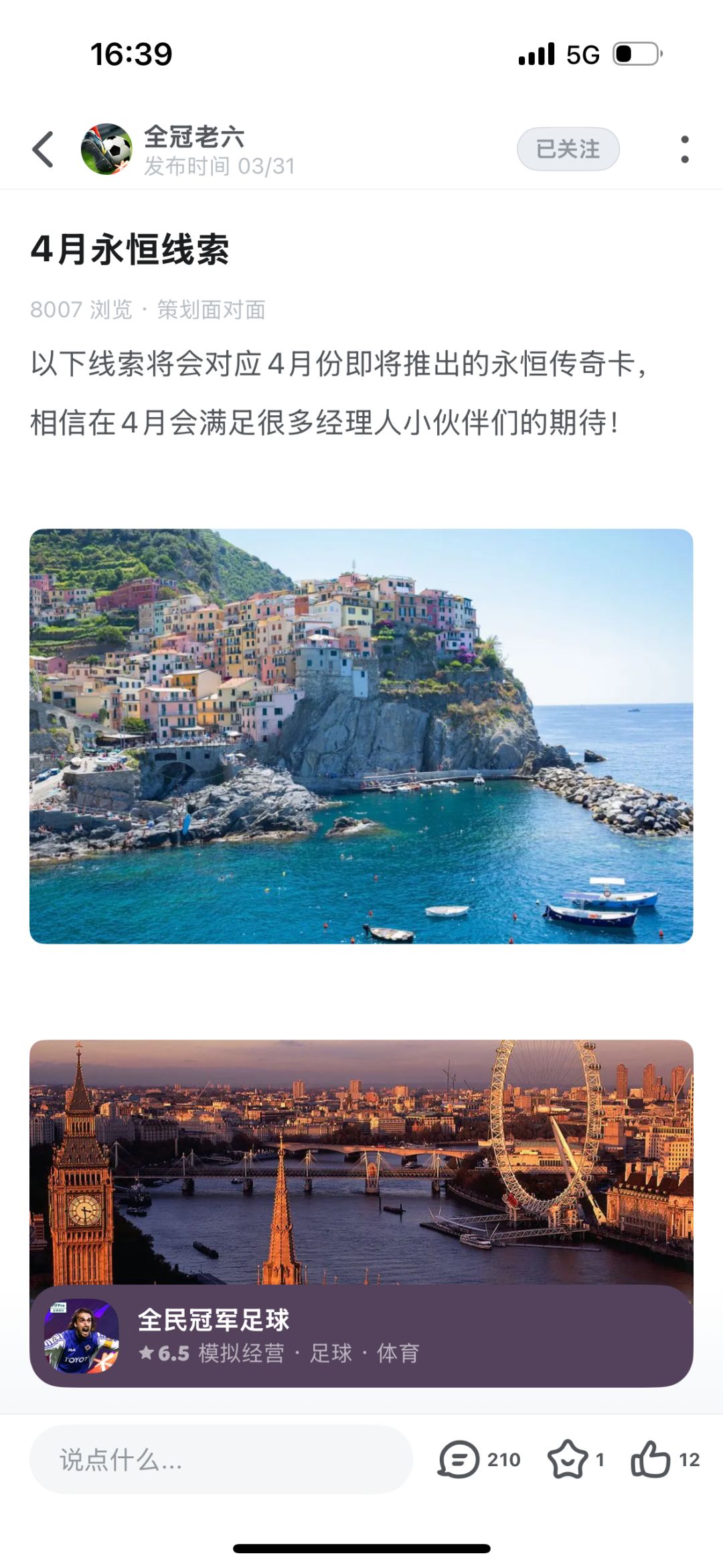 各位经理人,大家好呀!全民冠军足球新一期【传说侦探】活动开始啦,10.13~11.1期间每日签到即可领取超值奖励,全服累计签到达到指定次数后,可领取极为丰厚的钻石奖励。同时每个阶段都会解锁1条线索,你们心里是否已经有所猜想了呢? 虽然活动才刚开始,我们能获取的线索还不多,但是这又有什么关系呢,谁还没有点小期待呢~就让我们一起放心大胆猜起来吧!说出你认为即将上线的传说球员及理由,并为其规划几个好用的