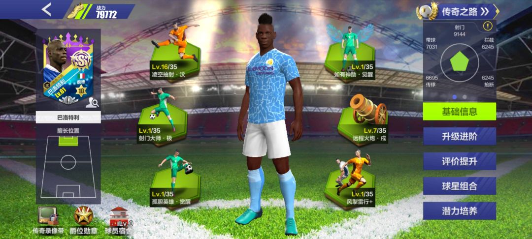 【玩法】 一,边锋终结者 加点:内切-讳-(空)-匝-花式-火炮-炫技(或压制) 优点: ① 各种秀带球,不是很好抢断,怕威慑需要配一个接应 ② 三必进。内切、火炮、炫技都有概率必进,所以不是特别怕封锁(禁锢)。另外花式有概率骗定位球,增强了花式失败的容错率。 缺点: 不能回撤要求,必须配转移,转移有可能被拦截,一旦转移失败,所有花里胡哨归零。 二,中路组织核心 加点:撞墙-胜-(空)-聿-穿针2
