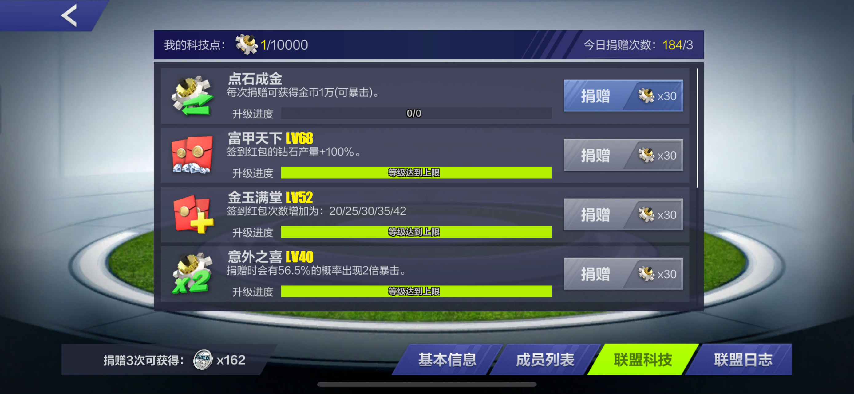 1️⃣这个盟战可以获得钻石➕功勋册,而且获得的量不算很少,确实是个很好而且合理的规划👍2️⃣联盟里面的“联盟科技”功能,几乎所有的高活跃盟都已经全部满级了,老区更不用说了,这个唯一的奖励就是金币,金币是一个很好的资源,但是这个页面给的实在太少,每天贡献就算贡献200次,也就五六十万金币,实在是太少太少了,平时用金币的地方都是几亿,十几亿的需求,真的是可有可无的来源;建议可以添加新的属性,新的词条