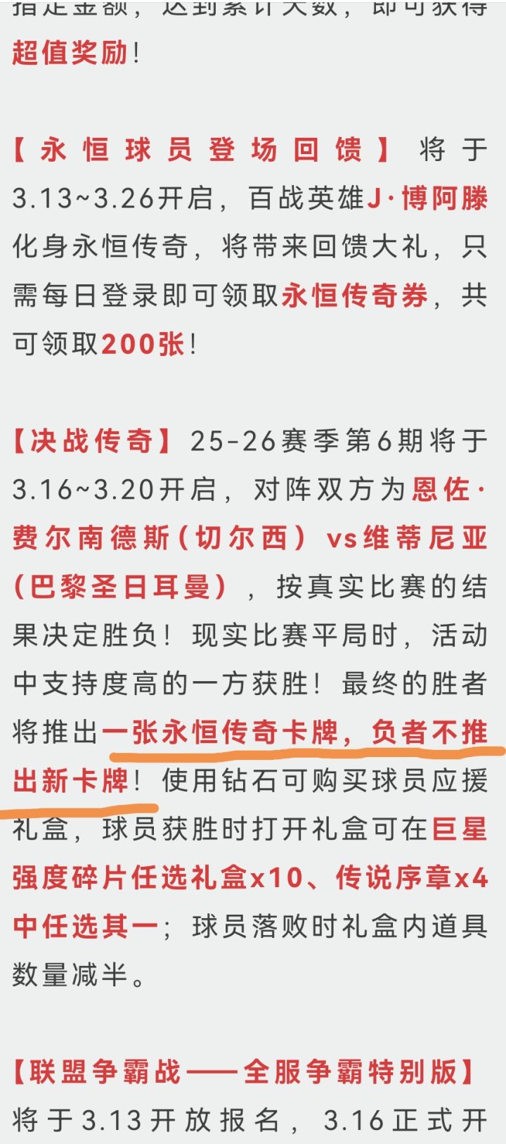 玩了7年了,第一次发帖子,附上人权图@全冠老六1,七周年那个大佬见面会活动的时候,我记得发了个新活动的截图,然后过了2个月了,怎么新活动还没实装?难道要到春节?2,能不能出一个自定义锁定球员功能,我跨服123阵球员,进不了信仰之战2阵3阵,一人为王的2阵3阵,经常在外面不小心卖掉球员组合+传奇之路,能不能自定义锁定某球员,传路+组合3,奖励送的太抠了,梦幻大乱斗这种类型的,能不能永久常驻,会