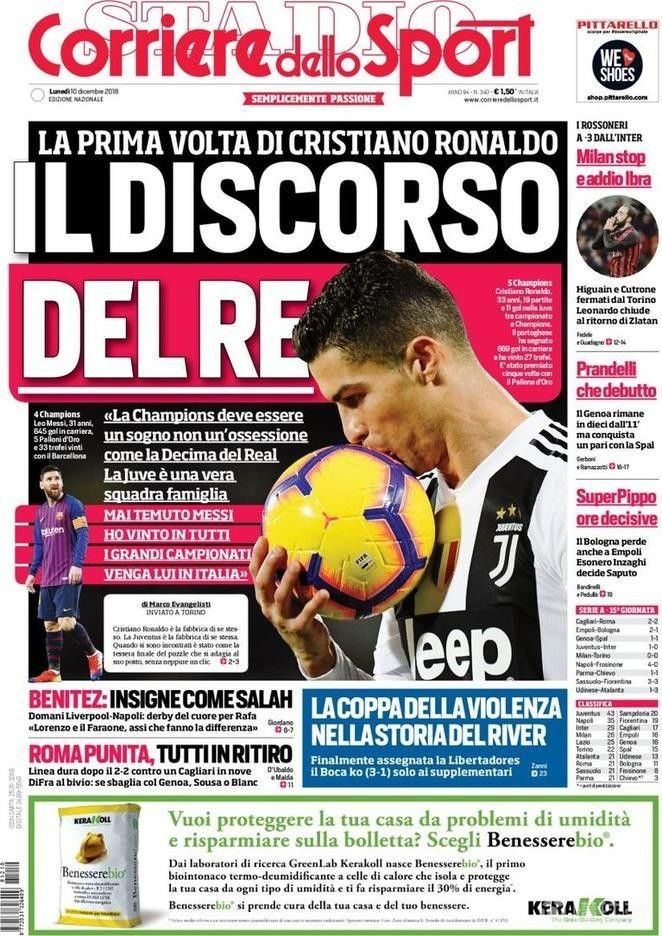 《罗马体育报》在今日封面刊登了C罗的专访,采访的完整版该媒体将在今天晚些时候放出。这篇采访的主题为《C罗第一次:与国王对话》,其中葡萄牙巨星谈到了尤文、欧冠和梅西等话题。C罗说道:“(对于尤文来说)欧冠不应该是一种执念,而是一个梦想,就跟当时皇马的第10座欧冠一样。”“尤文图斯这支球队是一个真正的大家庭。”“我从没有畏惧过梅西,我在到过的所有联赛中都赢得了冠军。”“他也来意大利踢球吧!”