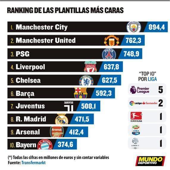 当今世界足坛,球员身价飞涨,要想打造一支具有战斗力的球队,必须要在转会市场上掏出大量的真金白银。近日,《世界体育报》就盘点了当今足坛十大阵容成本最高的球队,其中瓜迪奥拉执教的曼城以8.944亿欧元位居榜首。当然,曼城花费的近9个亿囤积起来的豪华阵容,并非全是出自瓜迪奥拉之手。比如斯特林、德布劳内、阿奎罗,他们便早于瓜迪奥拉来到曼城。不过,自从瓜帅执教曼城之后,球队也已经累计为他花费了5.3亿英镑