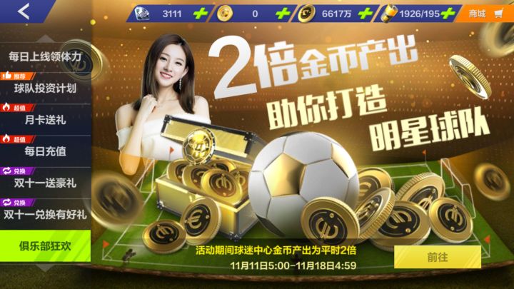 俱乐部狂欢活动,在11月11日5:00~11月18日4:59活动时间内,球迷中心的金币产出是平时的2倍,助力各位经纪人打造明星球队!