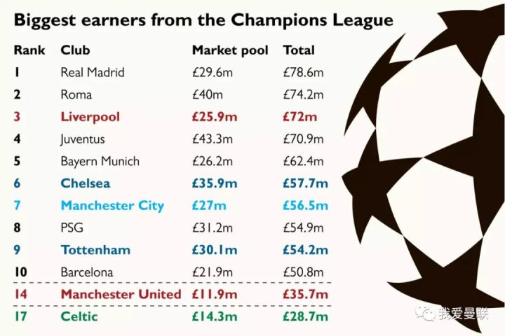 北京时间昨晚,欧足联公布了2017-18赛季欧冠参赛各队的奖金分配情况,曼联奖金为4034万欧元(折合3570万英镑),排在第14位,在英超5强球队中垫底,还不到利物浦的一半。由于曼联是以欧联杯冠军身份进入上赛季欧冠,无法获得联赛排名份额奖金(联赛冠军40%、亚军30%、季军20%、第四10%),因此曼联总奖金收入比起同在16强出局的切尔西和热刺都少了很多。欧足联共为上赛季欧冠参赛球队支付