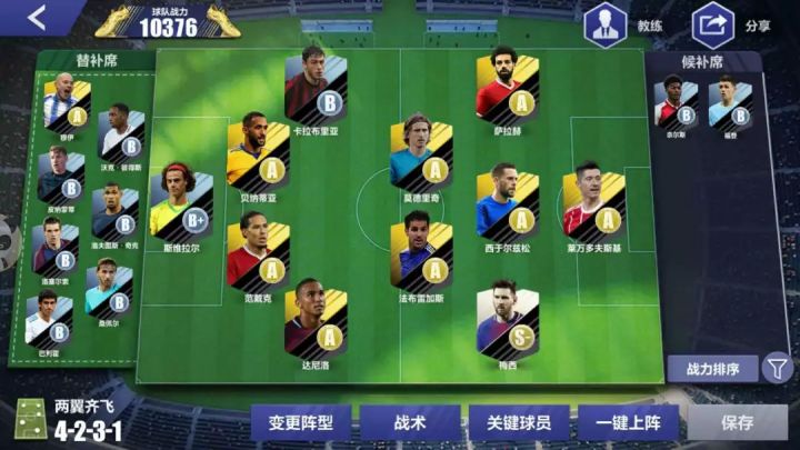 《全民冠军足球》不删档测试已全面开启,在游戏初期很多球迷因为对游戏还不太不了解,在阵型的编排及球员的选择上不知所措。游戏入门就送梅西和一票球星,但上场的球员只有11位。如何在新手时期也能玩的风生水起呢?下面秋人就给大家推荐一波值得前期入手的球星阵容,希望能帮到大家!首先是阵型方面,秋人我推荐的阵型是两翼齐飞4-2-3-1,这是一个边锋很强势的阵型。下面就以这一阵型为例,为大家来搭配球员!42