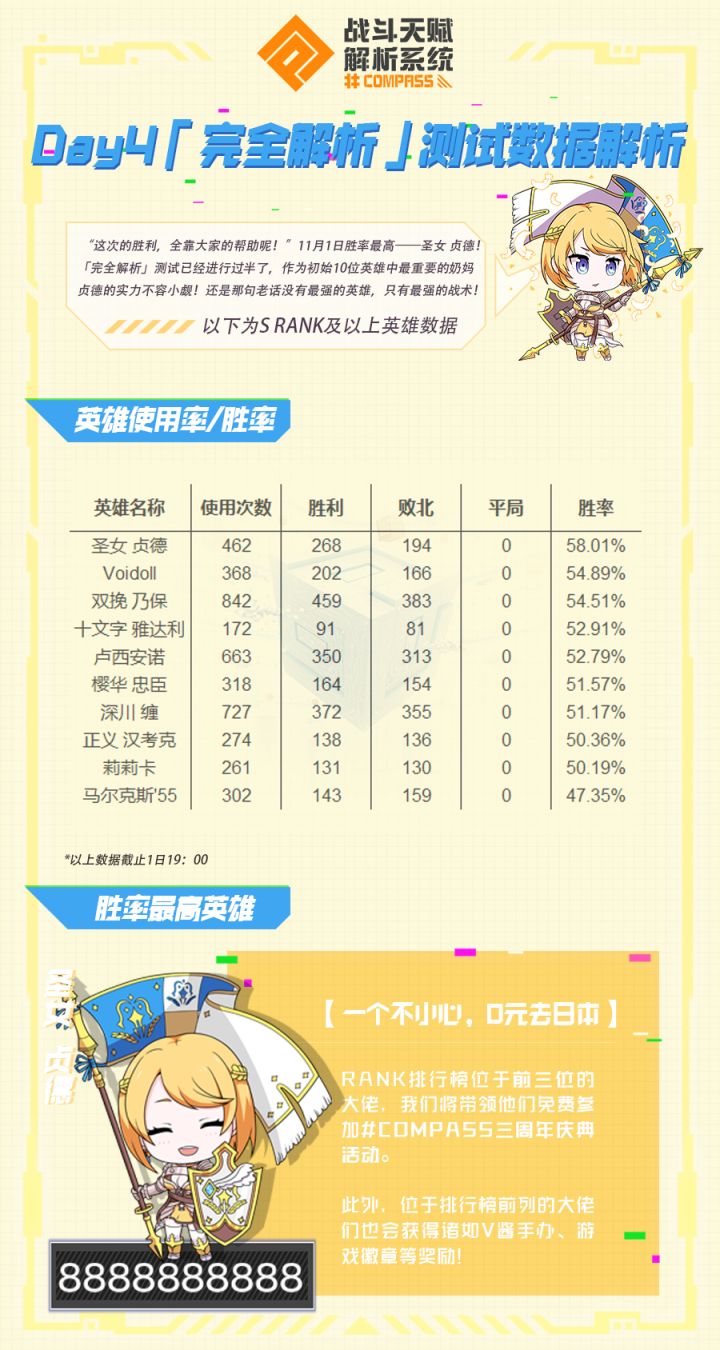 「完全解析」测试已经进行过半了,大佬们熟练掌握了英雄用法,也拥有了自己的配卡套路吧~测试第三天截止19:00胜率最高的英雄是——是初始10位英雄中最重要的奶妈贞德德!贞德就是后盾,贞德就是力量!“这次的胜利,全靠大家的帮助呢!”