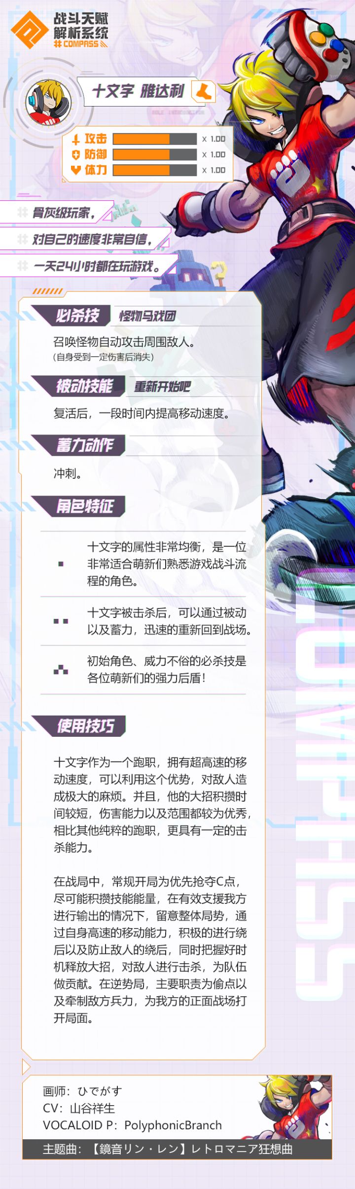 V酱の第一期英雄解析库上线,日常更新一些英雄相关的基本资料和YY资料(各种意义上关于英雄的猜想),想给新入坑的朋友或者正在等待国服的朋友介绍一下我们的英雄伙伴~~本贴下可以讨论所有关于这个英雄的一切!希望有大佬可以一起补充解析库哟!-基本信息-放大招时,他是这样的↓占点成功的时候,他是这样的↓-玩法介绍-十文字作为一个跑职,拥有超高速的移动速度,可以利用这个优势,对敌人造成极大的麻烦。