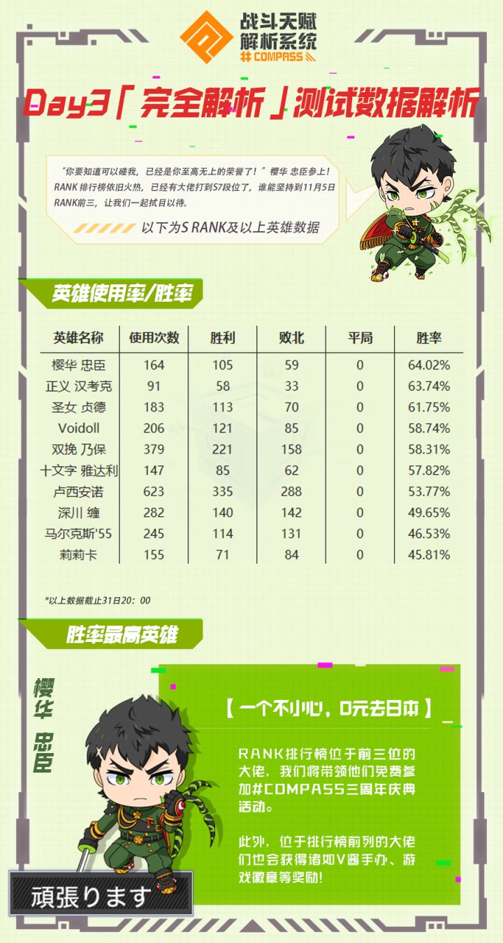 大家好!「完全解析」测试已到中期,越来越多的大佬打上S RANK了!截止到31日21点,S RANK大佬们胜率最高的英雄是?????嗒哒~~~~~是我们孤傲的妖军总帅樱华忠臣!!不愧是总帅“你的选择是正确的,放心吧!!”