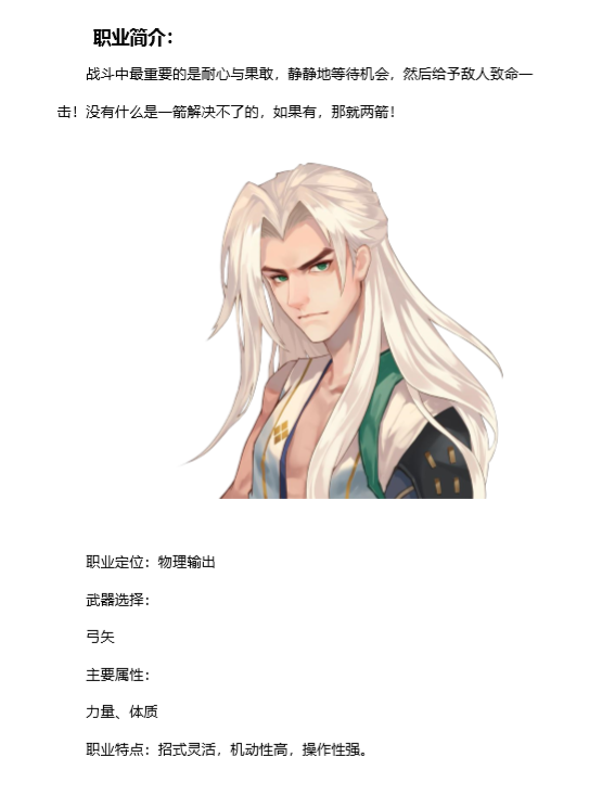 职业总体评价:外貌篇:游侠的外貌是可以读出性格,读出故事的,下面我们来看看这三套衣服:首先是未转职的游侠宝宝。白长直的秀发,裸露的胸膛,这位游侠冷峻的外表下一定是一个自恋症重度患者,如果不是节目不允许的话,我相信他会在秀身材的道路上越走越远。不过看在他身材长相都还不错的份上,这份自恋也是可以原谅的。流镝转职的游侠一看就是在转职后过上了上流社会的生活,锦衣华服,披金戴银,