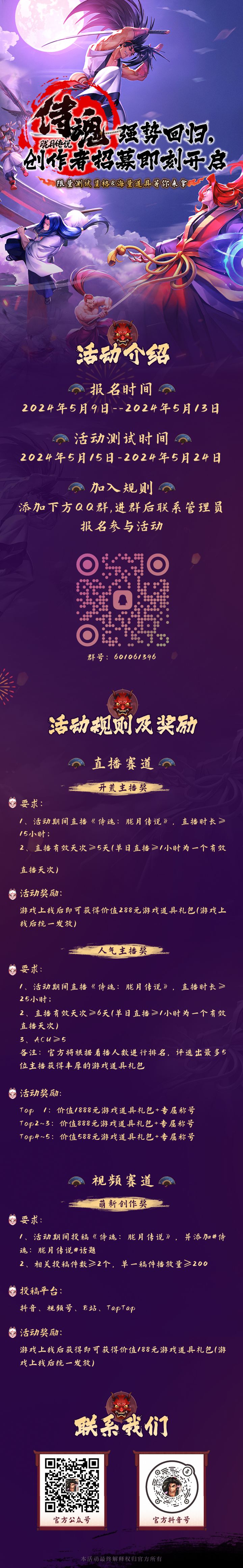 【侍魂:胧月传说】创作者招募来袭,公主王子请上车!!成为创作者,您将获得:限量测试资格&海量游戏内道具&限定称号本次活动将会有直播+视频两大赛道报名时间:即日起-2024年5月13日活动时间:2024年5月15日-2024年5月24日报名QQ群号:601061396还等什么,快来参与活动!限量测试资格+官方羊毛,等你来薅~