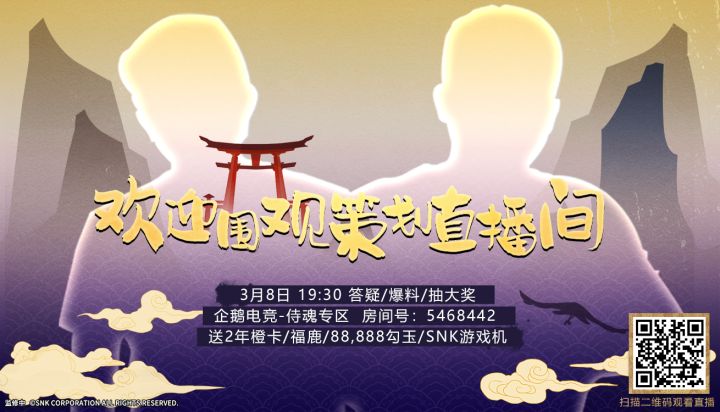 今晚19.30点!策划面对面第三期来啦!企鹅电竞-侍魂专区,房间号:5468442,扫描下方二维码围观直播!狗头策划与各位武者不见不散~同时也别忘了继续在评论区说说本周的建议和意见哦(σ゚∀゚)σ!本周主题∶游戏中希望分享/邀请的瞬间~