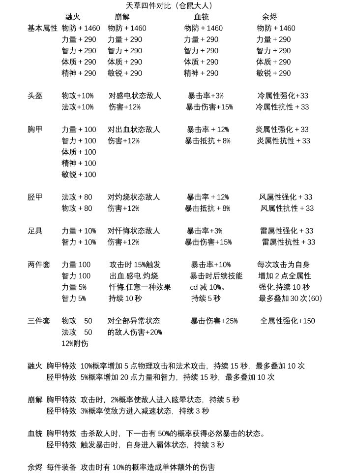 这里列下天草个个套装的属性 萌新可以进来看看哦狂刀推荐职业融火 狂刀的自残和血越少加的攻击都是百分比和融火很配巫祝本人不建议崩解 会少14.5%的血量 重点很多boss无法触发异常状态(应该是装备bug 感电的问题) 推荐融火 高强就选血铳其余职业做什么套装 差距都不大高强首选血铳 破防只吃暴伤无论是天草还是地藏 副本并不是很难 所以选什么套装差距并不大马上过年了提前祝大家新年快乐居