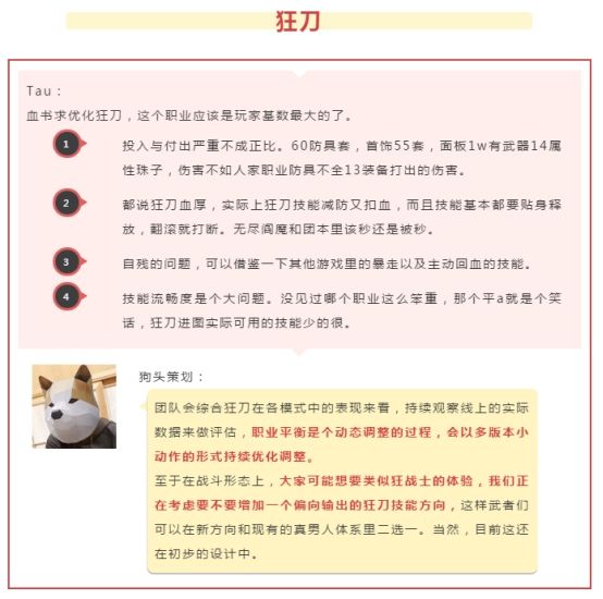 自从开启了每周献策活动以后,武者大大们献计策划的热情着实惊到莉姆酱啦~看来大家都很想为胧世界的优化出一份力呢!那么,本周的献计成果是什么呢?莉姆酱给大家挑选了一些较有代表性的问题,那么马上来看看狗头策划对大家提出的“职业的体验与平衡性优化”建议的反馈吧~以上就是本期的策划回复啦~看来各位武者大大对于自己职业确实都有不俗的见解呢~至于本周征集的建议主题(游戏交互易用性优化),相信关注