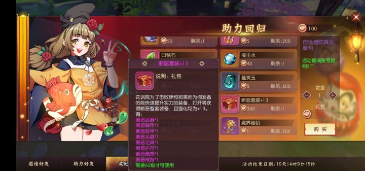 写给萌新的装备进阶建议今天65仙峰万象版本闪亮登场,有一些儿小伙伴回归,同时也有QQ区,微信区的新服务器开放,涌现出大量的新人玩家。这里故作资深的饼干来给大家分享下萌新应该如何快速成长并且精准进行自身装备的定位。回归玩家,如果装备进度跟不上,可以兑换断恶套装。如图:全身加13,面板特别高。不过缺点是,只有15天的使用时间。穿上一整套就有了7000+的抗磨,然后趁着带回归玩家过凶国有额外奖励这段