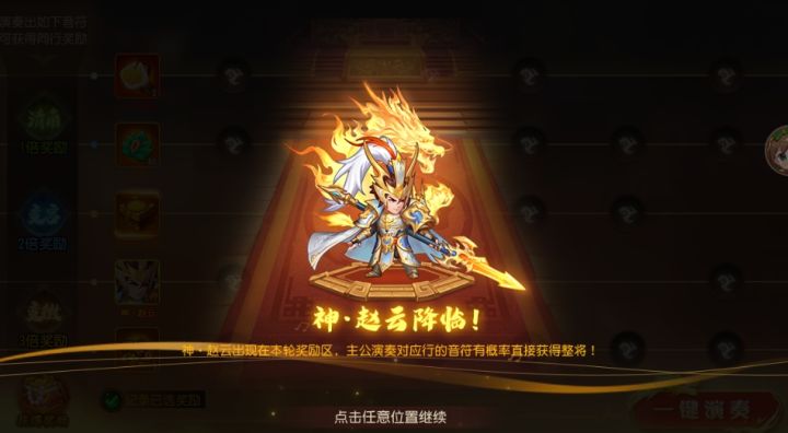 活动时间:8月13日 10:00——8月16日 00:00领奖兑换时间:8月13日 10:00——8月17日 00:00参与条件:服务器≥31天以上的服务器【活动规则】1、满足条件的服务器,等级≥30级的主公可以参与活动。2、主公每消耗1张清歌曲谱或300玉璧可以进入演奏1首乐曲,每日有1次免费演奏的机会,进入演奏后须先在奖励区选择目标奖励,选满5档奖励后可以开始进行演奏,主公可手动点亮