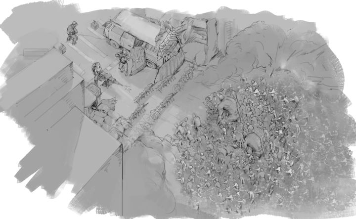 又一颗丧尸的头颅在枪声中绽放。脑浆、血液或是一些无法用言语形容的混合物质迸裂而出,血腥且恶臭,却又呈现出一种变态的艺术美感。这是这只可怜的丧尸「生命」最后的绝唱,也是这位持枪的艺术家倒数第二份作品——他只剩下最后一颗子弹。以枪为器,直指眉心,须臾间腥红的死亡之花绽放,这是他作为职业杀手独有的暴力美学,只不过在如今的世界里,猎物由活生生的人变成了空有人皮的行尸走肉,热烈的腥红也夹杂了变异的色彩,