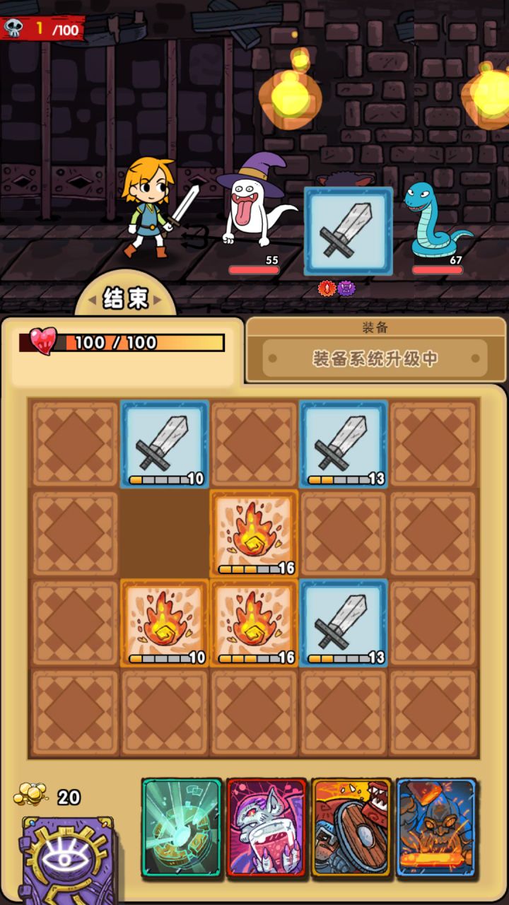 一开局,先挨几轮打,磕药、用掉吸血鬼牌+群攻,不要还手。对,就是攒。盾牌满级了就挂上,大剑和斧头留着,用Max22小剑或者火球打怪。以上攻略最好在看到台阶后,留下一个怪来刷。刷到全身Max大剑和Max斧头,3个给牌升级的道具,1个吸血鬼,就保持住。每回合的三次抽牌不要浪费哦,只要有金币就买那个能把牌升到顶级的。只要像欧介样,你就会艾像介款游戏!