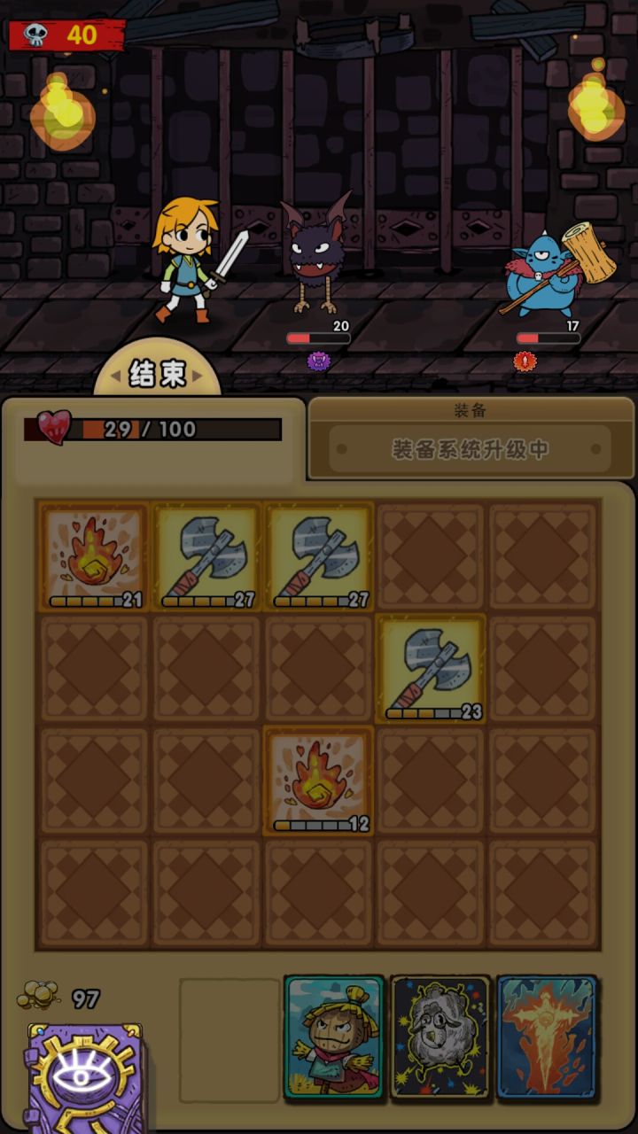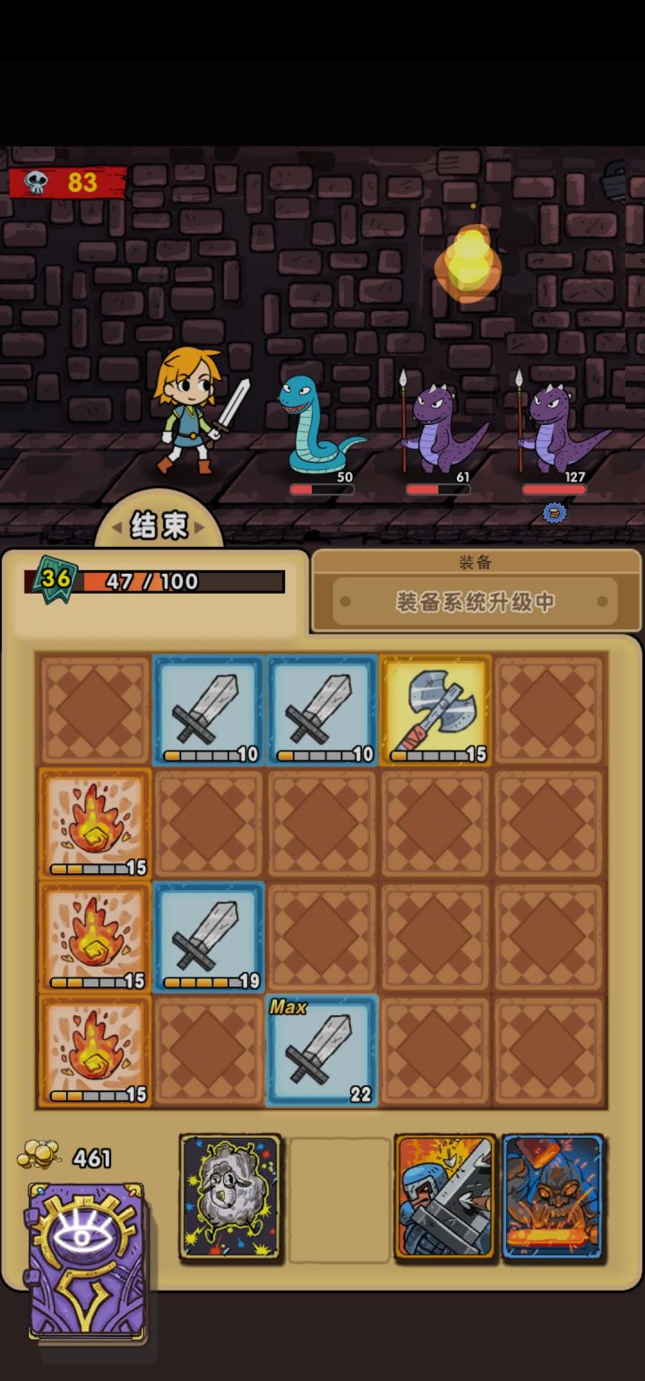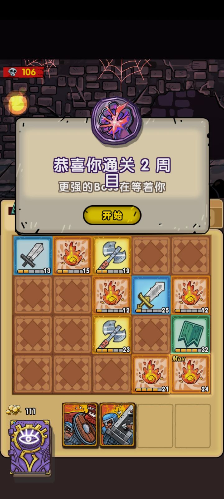 第一次玩就通了两周目,感觉真的没什么难度,套路就这么多。打法很简单,就是翻牌等回合升级,等级满了就用,等级不高且没法杀死怪就过。道具就那么几个有用的,一个是升满牌的技能,一个是吸血,还有一个是翻牌,其他道具性价比都太低,没用。这游戏就是打怪,挣钱,买道具,更简单地怪,挣钱,然后打boss。没啥其他内容比如额外时间啥的,太无聊。