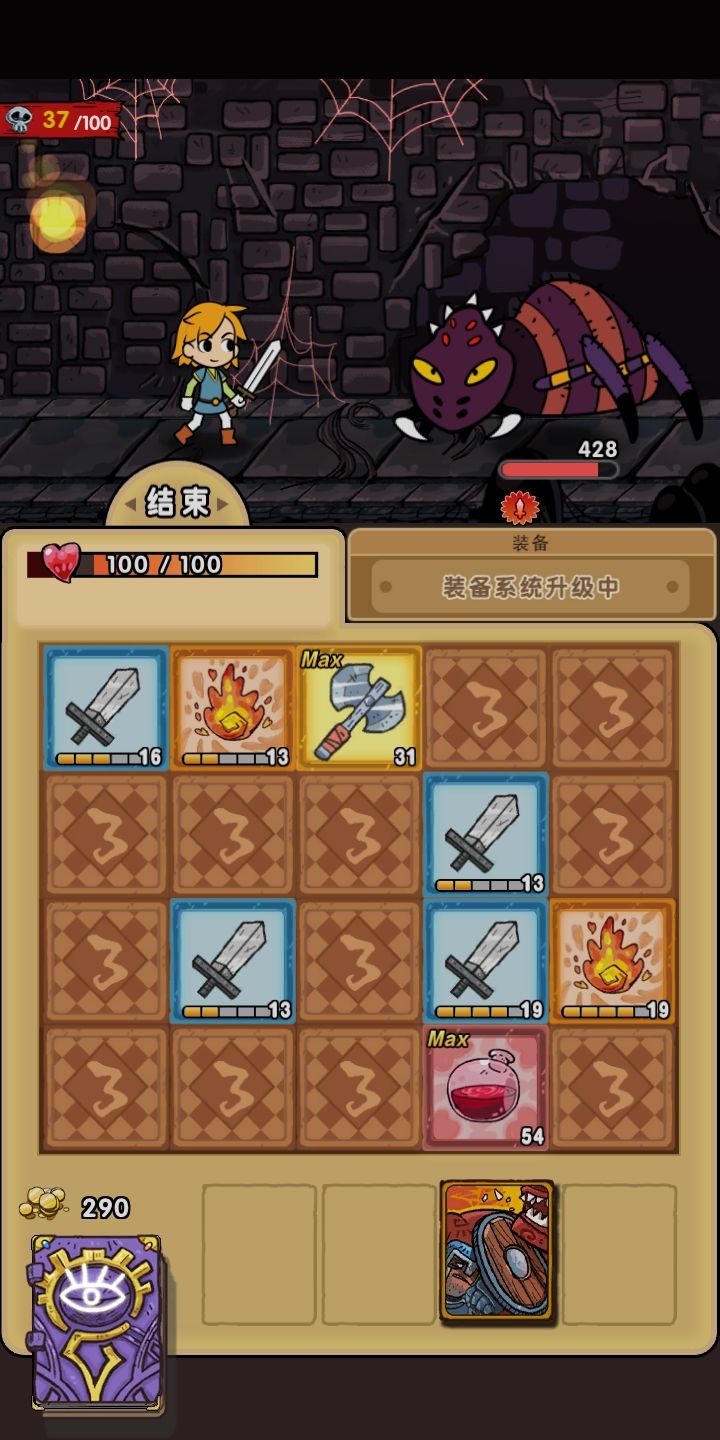 第一次玩就通了两周目,感觉真的没什么难度,套路就这么多。打法很简单,就是翻牌等回合升级,等级满了就用,等级不高且没法杀死怪就过。道具就那么几个有用的,一个是升满牌的技能,一个是吸血,还有一个是翻牌,其他道具性价比都太低,没用。这游戏就是打怪,挣钱,买道具,更简单地怪,挣钱,然后打boss。没啥其他内容比如额外时间啥的,太无聊。