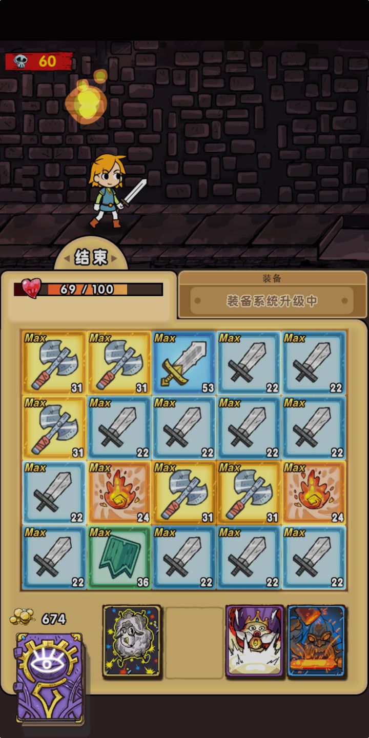 第一次玩就通了两周目,感觉真的没什么难度,套路就这么多。打法很简单,就是翻牌等回合升级,等级满了就用,等级不高且没法杀死怪就过。道具就那么几个有用的,一个是升满牌的技能,一个是吸血,还有一个是翻牌,其他道具性价比都太低,没用。这游戏就是打怪,挣钱,买道具,更简单地怪,挣钱,然后打boss。没啥其他内容比如额外时间啥的,太无聊。