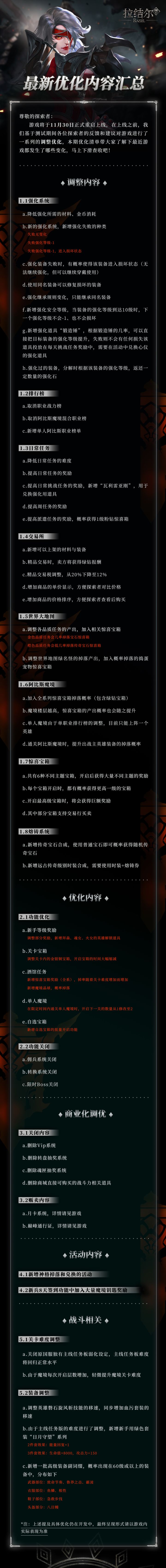 尊敬的各位探索者:我们关注到动视暴雪和网易分手的消息,很多游戏将停止运营,不止“炉石”,“魔兽”的玩家,“暗黑ARPG”玩家将失去游戏乐土。感叹玩家不易,希望在这个冬天给“心碎玩家”们带来温暖。《拉结尔》纯净版将于11月日30日上线并带来大量福利内容,忠心希望“心碎玩家”能在《拉结尔》纯净版找到失去的快乐。《拉结尔》纯净版 探索者不心碎我们仔细研究了市面上的游戏。发现除了关服,很多不合理设