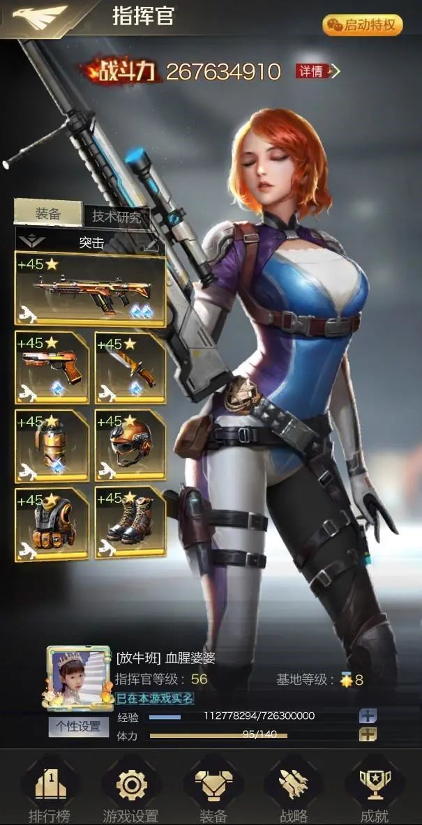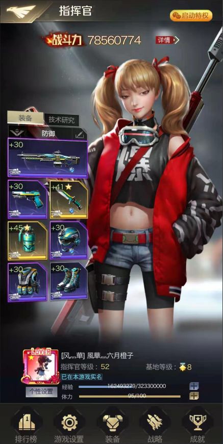 橙子,游戏ID“風華灬六月橙子”,来自微信13区。最喜欢研究怎么提升自己,势要超过联盟的男生,让他们都叫我橙子大姐大!爱好追剧、旅游、打球、K歌,同时也是一个军迷,喜欢看有关军事的讨论,闲来无事也会看看书。她每天半夜都在线,被称为“夜游神”。 Q:女神,您好~感谢您接受我们的采访,在正式提问之前呀,能不能先向大家做个自我介绍呢? 橙子:大家好我来自微信13区的橙子,我所在的盟是“炎黄江山”。 Q: