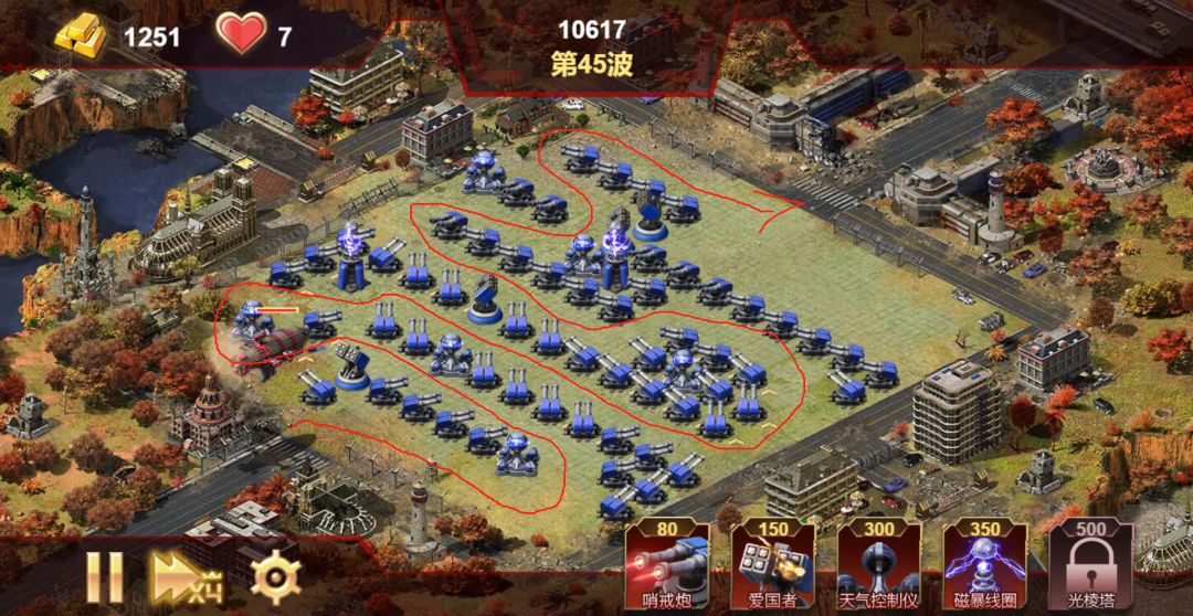 红警OL》塔防小游戏刚刚上线,就有很多指挥官迫不及待去体验了,有些指挥官很快就倒在了幽灵的冲击之下,有些指挥官们则比较坚挺,挡住了一波又一波幽灵的进攻。今天,我就分享一个非常好用的阵型,想要冲榜的不妨试一试。 阵型推荐 该阵容的重点在于圆圈的搭建,在阵型(地图)的两边,分别布置一个圆形的阵容。阵容最中间放置“天气控制仪”,有条件还可以放置“磁暴线圈”,周围用“哨戒炮”包围,用来消灭路过的所有敌人。