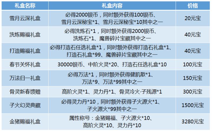 为了庆祝第一个春节的到来,斗气大陆也为各位斗者准备了丰厚的大礼包,礼包中包含了功法、内丹、强化石等各种道具,礼包多多福利多多。究竟有哪些超值大礼包呢?快来一起看看吧!这8种超值礼包都是限时出售的,截止到2月15号,想要购买的斗者一定要注意礼盒的销售时间。雪月云深礼盒是功法礼盒,若获得雪月云深秘宝,可以从沉月诀、虹光吹雪、云深不知处、翻江倒海这四种功法中任选一种。这四种功法会随机出现在家族拍卖中