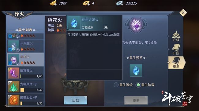 随着斗气大陆的不断更新,现世的异火也越来越多,但是目前只有4个异火可以出战,16个异火可以上阵,那么多余的高等阶异火该怎么办呢?今天呢就带大家了解一下异火等阶重生系统。异火重生可以重生等级也可以重生等阶,不过都只能返还75%的经验和碎片,所以若是没有集齐20种异火的斗者不建议进行异火重生。2级以上的异火可以重生等级,重生后可以获得一部分火灵;3阶以上的异火可以重生等阶,重生后可获得碎片。重生