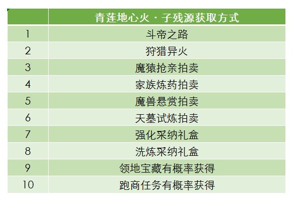 青莲地心火在异火榜排名第十九位,是萧炎所炼化的第一种异火。今天就带大家看一下青莲地心火·子的获取方式。获取青莲地心火·子残源最主要的途径就是完成斗帝之路。完成相应的斗阶试炼就可以领取所对应的试炼礼包,打开礼包后就可以获得一定数量的青莲地心火·子残源以及永久期限的外观。通过狩猎异火也可以获得青莲地心火·子残源,甚至有几率狩猎到完整的子火。家族拍卖也是获取青莲地心火·子残源的主要方式之一。每天中