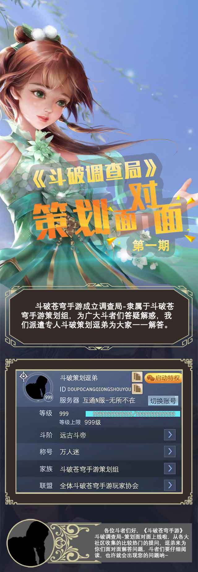 斗破苍穹手游成立调查局-隶书于斗破苍穹手游策划组,为广大斗者们答疑解惑,我们派遣专人斗破策划逗弟为大家一一解答,大家有什么问题也可以提出哟!