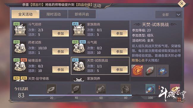 嗨喽,大家好啊。今天为大家带来天焚炼气塔试炼挑战的攻略,希望对大家有所帮助哦。选择阵容天焚炼气塔试炼挑战最多为两人组队挑战,单人可自己组成队伍开始挑战,但难度不减。所以建议大家组上自己的小伙伴一起挑战,可以达到更高的挑战层数哦。这里还有一个便捷的方法,就是找家族里高斗气的大佬带,有强者助战,高层数自然不在话下。战斗技巧人阶、黄阶、玄阶、地阶一般都是一些小怪或者精英怪,此时我们可以根据自身的