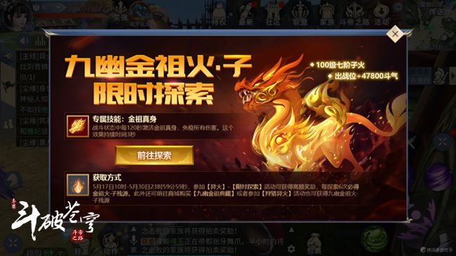 经过漫长的等待之后,100级等级上限终于开启啦!与此同时,子火榜排名第七的九幽金祖火也一起现世,作为目前排名最高的子火,来一起看看它有什么功能吧!本次活动时间为5月17日10时——5月30日13时59分59秒,可以在异火—限时探索中通过探索来获得九幽金祖火子火碎片、灵力丹等奖励,也可以通过狩猎异火获得。活动期间,狩猎异火时获得九幽金祖火碎片的几率增加。九幽金祖火可以提供体魄、攻击和元素暴击