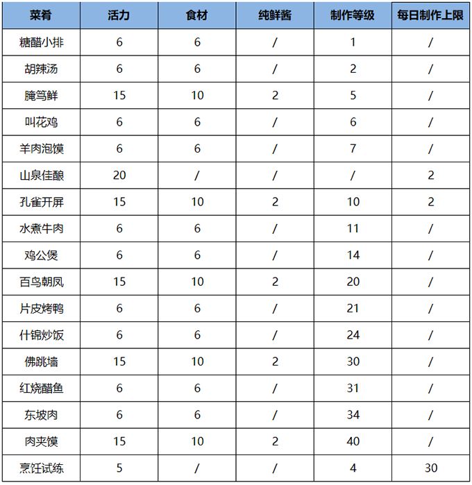 在《雪鹰领主》手游中,生活技能分为消耗体力和消耗活力两种,烹饪属于后者。烹饪制作的菜肴种类是所有生活技能中最多的,包含了各大菜系的特色菜肴,十分丰富。菜肴制作烹饪需要消耗活力、食材和纯鲜酱,不同的菜肴消耗的数量也有区别,具体请看下方表格:注:根据菜肴不同,消耗的食材品级也不同哦。菜肴用途通过烹饪制作的菜肴是可以放在交易行售卖的,但需要注意使用绑定的原材料制作的菜肴是绑定的,不能售卖,也不
