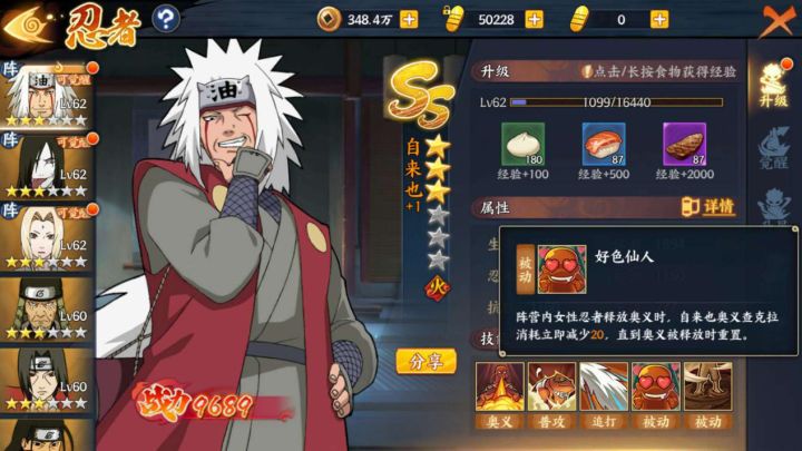 天空一声巨响,小吉踏雪而来,嘻嘻~大家都知道我们的火影忍者OL是一款对原IP还原极高的游戏,比如木叶村地图、副本剧情等等。不知道大家有没有发现,其实我们的忍者技能也跟角色本身有关系,就拿火影中的老师——自来也来说,他是一位桃李满天下的老师,带出来的学生基本上每个都左右忍者世界的发展。但这个人物同时也有个好玩的设定,比较好色,最惨的时候偷看女生洗澡被纲手打瘫在床。正是这个好玩的设定,于是在我们游戏