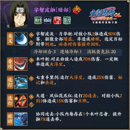 简介:宇智波鼬【暗部】在手游当中是较容易获得的,作为一个具备不错追打属性的忍者,应该如何搭配一个好的阵容?宇智波鼬【暗部】在火影忍者OL手游当中也是有着追打小王子的称号,其比较容易触发的追打条件以及给团队带来的一些增益,也让很多小伙伴们对这个忍者提起了很大的兴趣。在大家了解宇智波鼬【暗部】的奥义的时候,首先也能够感觉得到所具有的爆发能力。想要在游戏当中对其有更深一步的认识,小伙伴们首先应该回归火