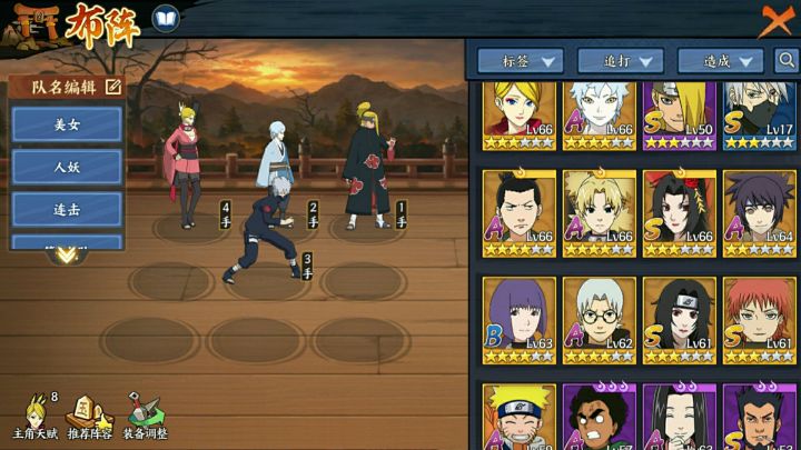前面的关相对于比较随意 后面的 基本建议大家别开倍速 需要点的挺多的4-16第一回合 尽量刷出我爱罗连击 天天技能什么的先挨着等小李放出奥义 我爱罗连击后宁次攻击前 井野奥义小李第二回合 笕奥义宁次 我爱罗奥义红 等井野普攻出去 风主奥义刷新井野奥义天天第三回合 笕奥义天天 结束战斗4-17第一回合 九狼奥义手鞠 普攻连击清猴子第二回合 手鞠奥义初代打断 九狼普攻后点