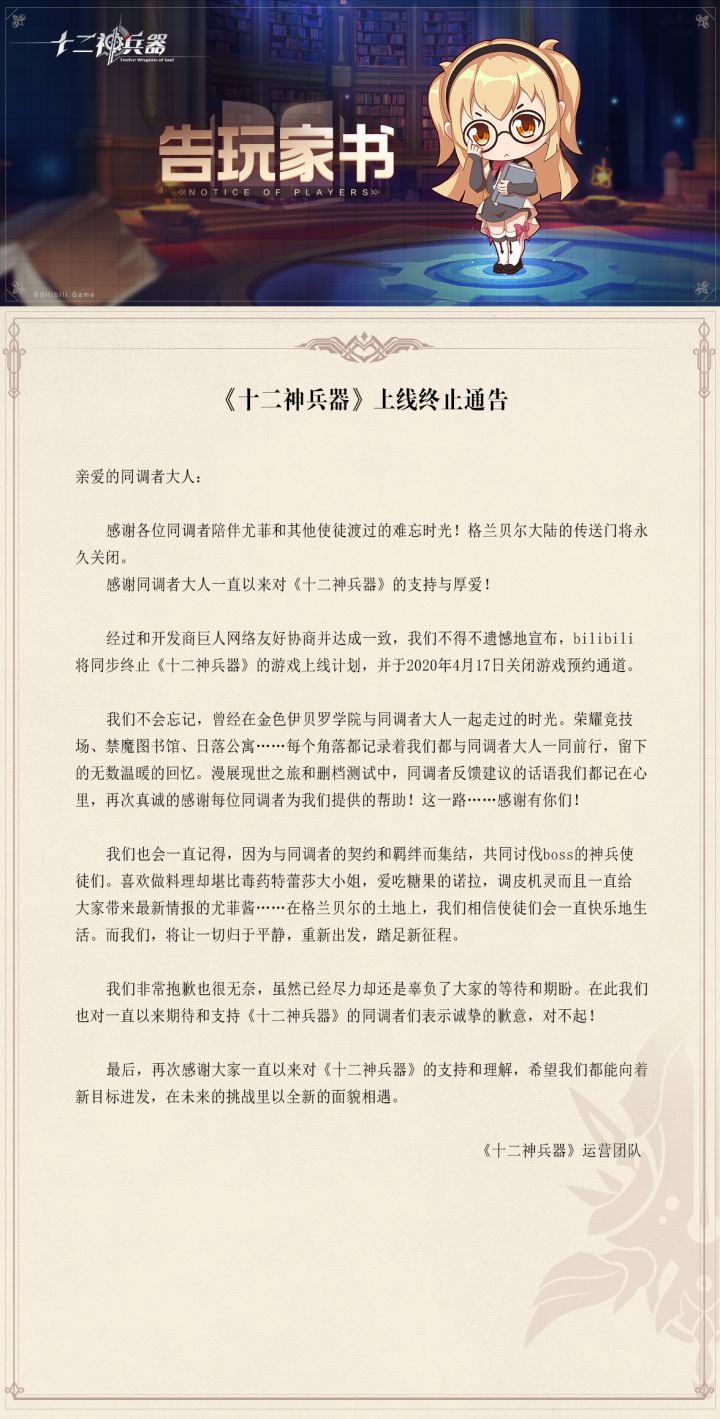 亲爱的同调者大人:感谢各位同调者陪伴尤菲和其他使徒渡过的难忘时光!格兰贝尔大陆的传送门将永久关闭。感谢同调者大人一直以来对《十二神兵器》的支持与厚爱!