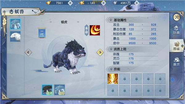 天玄大陆,妖兽众多,尤其在妖域中,更是有着四大霸族、八大王族,完全由妖兽当家做主。以下就让貂爷带大家认识游戏中的妖兽系统吧!武动乾坤手游中的妖兽系统在大家达到天元中期,并完成相应的主线任务之后就会开启,开启时大家会自动获得一个妖兽——银虎,属于火蟒虎一族的分支。妖兽提供的属性不像萌宠那样单一,而是同时提升攻击、暴击伤害、附加伤害、暴击以及命中五种属性,对战力的提升非常巨大。妖兽可以升代,目前为