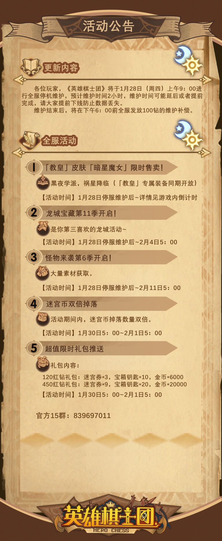 各位玩家,《英雄棋士团》将于12月30日(周四)上午9:00进行全服停机维护,预计维护时间2小时,维护时间可能延后或者提前完成,请大家提前下线防止数据丢失。 维护结束后,将在下午6:00前全服发放100钻的维护补偿。 维护结束后新服「S101玲珑尸姬」同期开放,后续我们将根据玩家人数动态开服,详情请关注弹屏公告。 ----------全服活动---------- 活动1 【新年签到活动】 【活动时