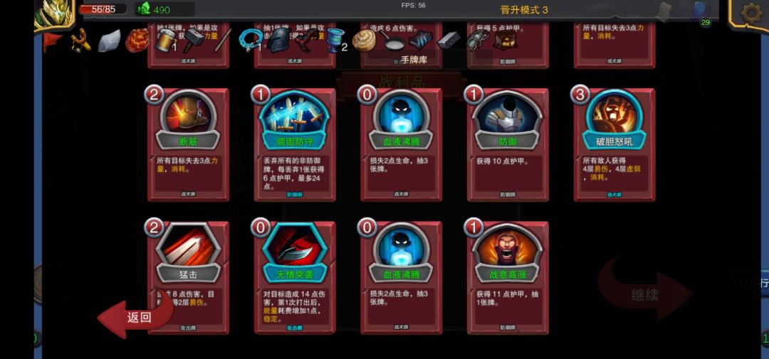 杀戮尖塔换皮,半成品还太监了,安卓玩起来不能全屏 选简单路线,营地多的,可以多升级卡,或者问号多的 杀怪+3血、加血牌、盾等利用好,保持血量健康,在篝火时可多升级卡 扣血、拿诅咒牌、扣钱、给自己+负面buff等,要评估划不划得来 卡推荐:断筋,狂暴姿态、狂暴攻击 注意技巧:会回血、力量每回合增加的速杀,那种50%血量就会分裂成两个的史莱姆,注意卡好血量,有些怪可以慢慢打等