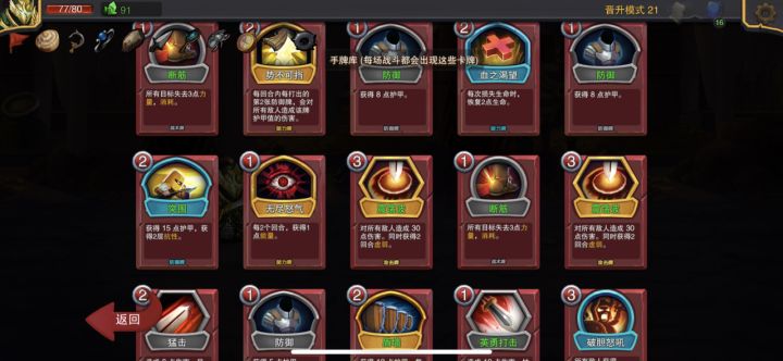 这游戏现在应该没有太多人玩了,但是还是发表一下我的套路吧:(基于困难21)1、这个游戏第一章是最难的,如何渡过第一章基本就通关、除非太过脸黑。2、卡组:必拿万配牌:断筋(遇到必拿、遇到复制和升级必首选)、盾墙,坚定意志和忘却疼痛选用一张,断筋是神牌没有之一没有异议。3、天赋:首选加能量,第一章boss后遇到束缚之链必拿(你有多小机会一回合出多过6个牌?)第二邪能火炬,其他天赋看流派。4、套