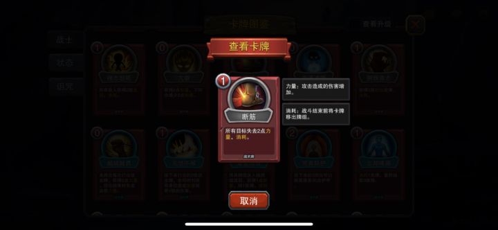 说说这游戏的卡牌套路,想过关,首先几个必选卡牌,无敌你要有,就是加32护甲的那个,升级一下加42护甲,最好是两张,如果有盾猛搭配更好,,也要升级,别问为什么,升级0费。。站的住才有输出,第二就是每回合加两点力量那张拍,升级变两费,你不选,第三关boss别想过,,然后就是加能量的牌,有一张0费加一点能量,升一下加两点,有能量才有输出,才站的住,还有破胆怒吼,升级以后3费6虚弱加6易伤,这是我感觉完美通关必选的几张牌,