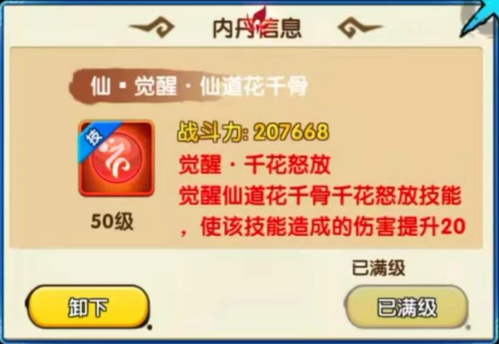 哈喽各位上仙小伙伴们大家好呀,今天 给小伙伴们带来的就是红宠专属内丹。仙道花千骨专属内丹:仙.觉醒.仙道花千骨战斗力:207668当前:伤害+350700,暴击率+49.28%,生命+12042012觉醒.千花怒放:觉醒仙道花千骨千花怒放技能,使该技能造成的伤害提升20% 千花怒放:使用仙道之力迫使花瓣围绕自己,3秒后释放力量,总计造成2100%伤害,15秒冷却。使用专属内丹后,使该技