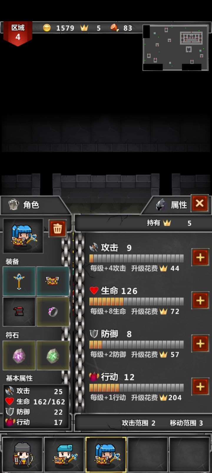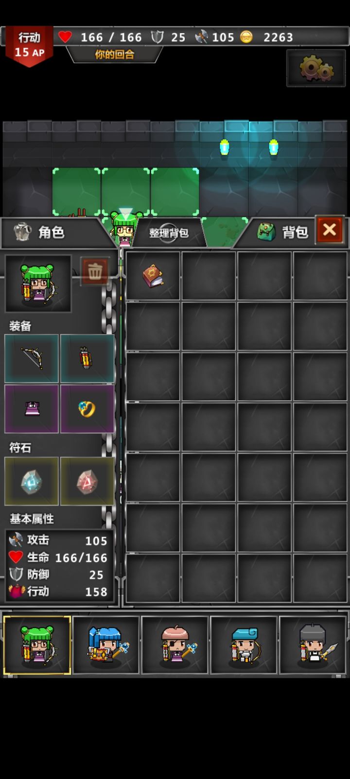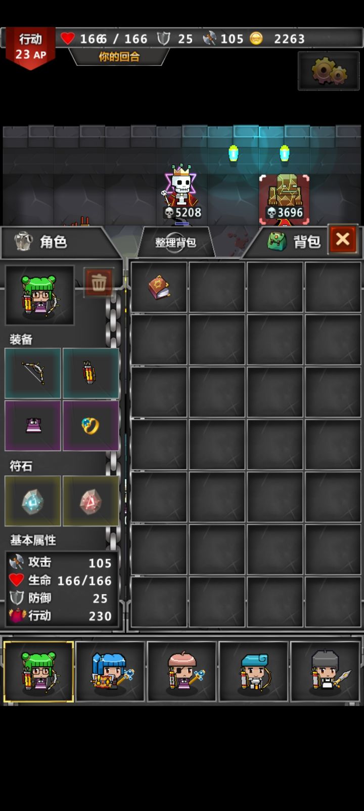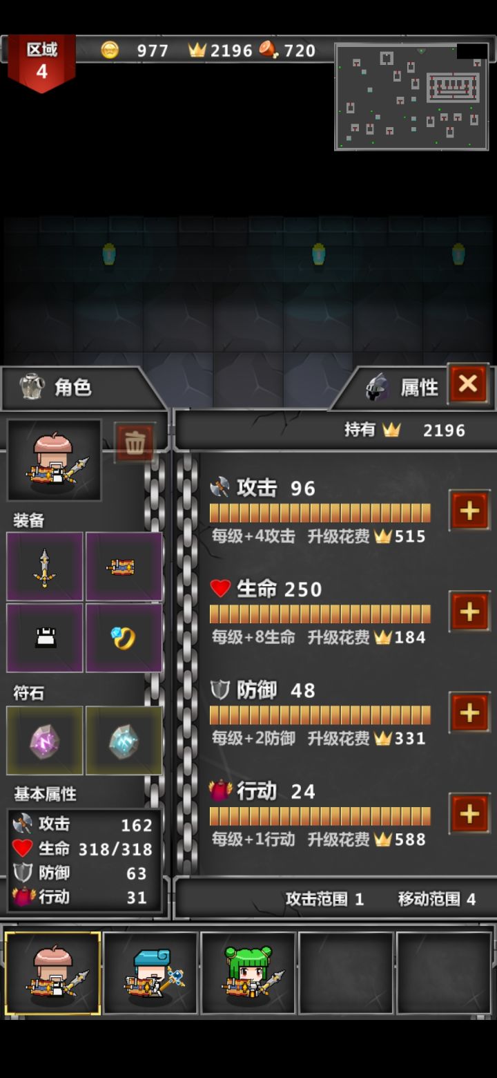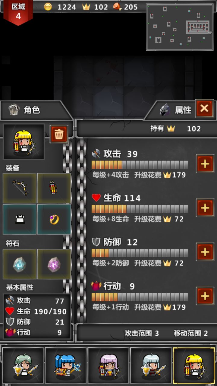 这是我的通关阵容说实话打最后boss本来想什么加攻击什么的慢慢打的可是我的这个老大哥不听话 上去第一刀必杀直接杀了boss,然后地形问题,我用三尸体卡住了对面的剩下的怪,用电一个个电死了,莫名通了。个人观点:1.游戏一二层可以速通过了,到了第三层可以刷一下,第四层之前建议有一个老大哥(类似上面我最后那张图中的人物)靠老大哥可以迅速刷普通怪(一回合斩杀)2.装备前期不用去黑商那买,我个人