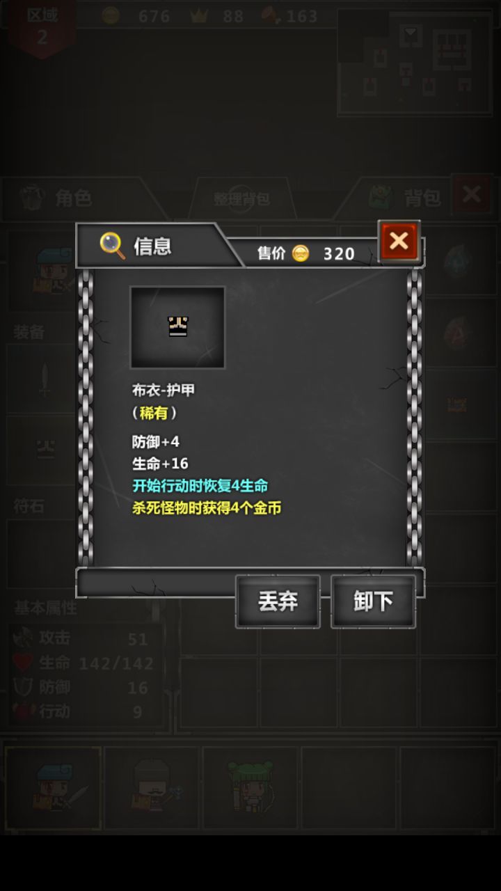 这是我的通关阵容说实话打最后boss本来想什么加攻击什么的慢慢打的可是我的这个老大哥不听话 上去第一刀必杀直接杀了boss,然后地形问题,我用三尸体卡住了对面的剩下的怪,用电一个个电死了,莫名通了。个人观点:1.游戏一二层可以速通过了,到了第三层可以刷一下,第四层之前建议有一个老大哥(类似上面我最后那张图中的人物)靠老大哥可以迅速刷普通怪(一回合斩杀)2.装备前期不用去黑商那买,我个人