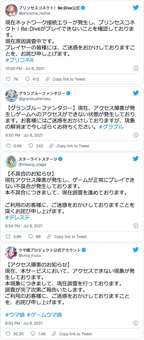 Cygames 的服务器在昨天一度发生大规模故障,包括《碧蓝幻想》《公主连结Re:Dive》《偶像大师 灰姑娘女孩 星光舞台》《赛马娘》之内的游戏全都中招。在这之中,只有《影之诗》《弹射世界》不知为何幸免于难,于是......