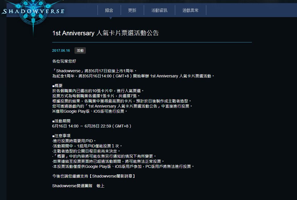 简单的说就是每个职业人气第一的角色会被制作为主战者皮肤,请各位积极参加吧!(好想要吸血鬼的怠堕魔皮肤呀~) 官网正文: 各位玩家您好 「Shadowverse」將於6月17日迎接上市1周年。 為紀念1周年,將於6月16日14:00(GMT+8)開始舉辦 1st Anniversary 人氣卡片票選活動。 ■概要 於各個職業內已選出的10張卡片中,進行人氣票選。 投票方式為每個職業各選擇1張卡片,共