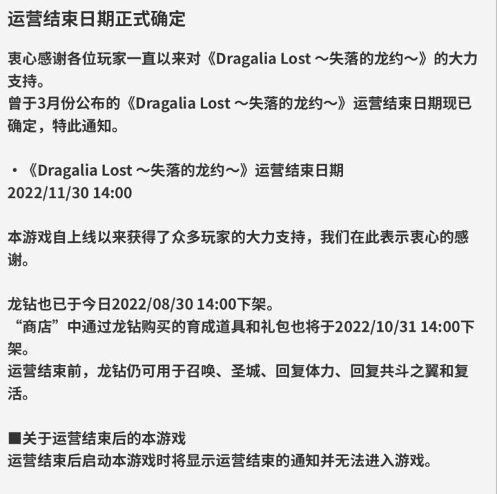【再见了】《失落的龙约》将在11月30日14:00正式结束运营
