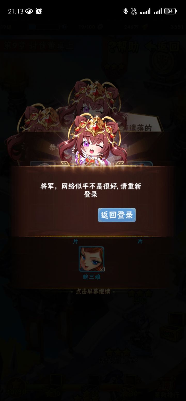 我也是服了,刚开始玩,游戏前期剧情动画慢就不说了,从第八章开始,每打完一章拿奖励就提示网络不好让返回重新登陆,我怎么玩?